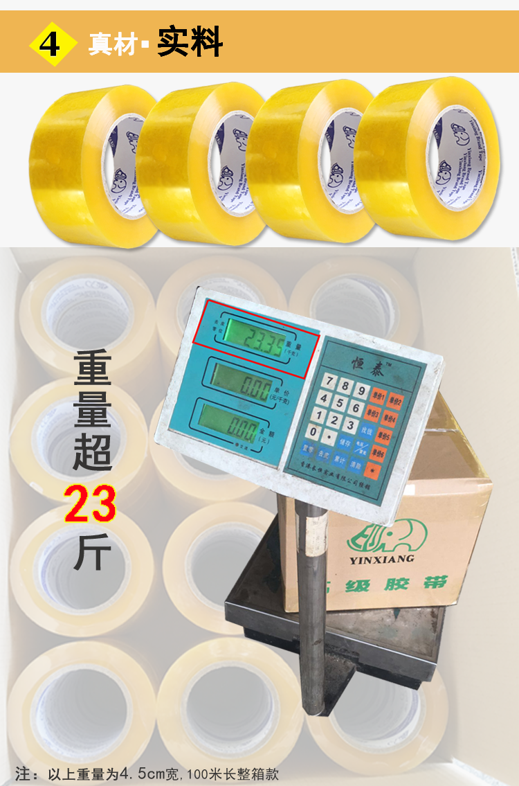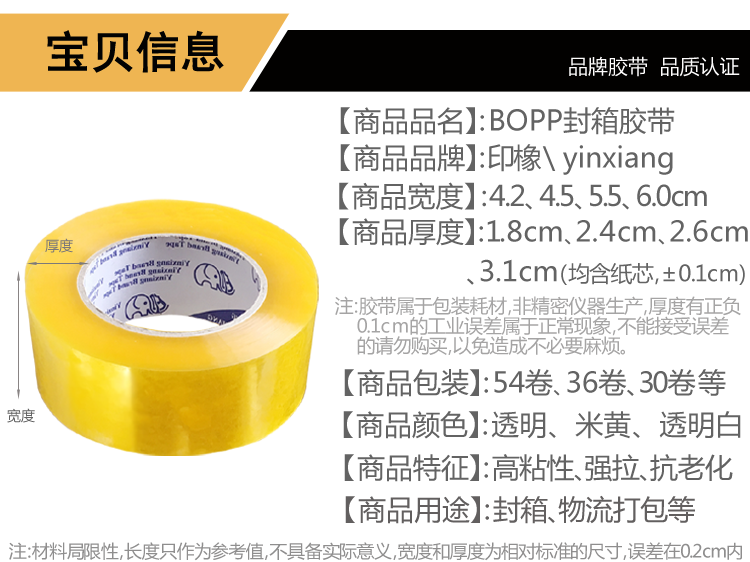 【商品品名】:BOP封箱膠帶【商品品牌:印橡\ yinxiang【商品寬度】:42、45、55、60cm【商品厚度】:1.8cm、2.4cm、2.6cm3.1cm(均含紙芯,±0.1cm)注:膠帶屬于包裝耗材,非精密儀器生產厚度有正負0.1cm的工業(yè)誤差屬于正常現(xiàn)象,不能接受誤差的請勿購買,以免造成不必要麻煩。【商品包裝】:54卷、36卷、30卷等【商品顏色}:透明、米黃、透明白【商品特征}:高粘性、強拉、抗老化【商品用途】:封箱物流打包等